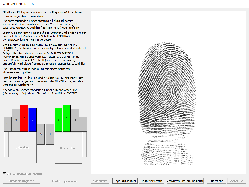 Telebild 2000 GSAT FastID führt den Benutzer durch die Erfassung der Personen- und Fingerabdruckdaten, wobei ein Livescanner oder Flachbettscanner für die Aufnahme verwendet wird. Die Finger werden während der Aufnahme auf Qualität und Stimmigkeit geprüft und zum Ergebnis Rückmeldung gegeben.