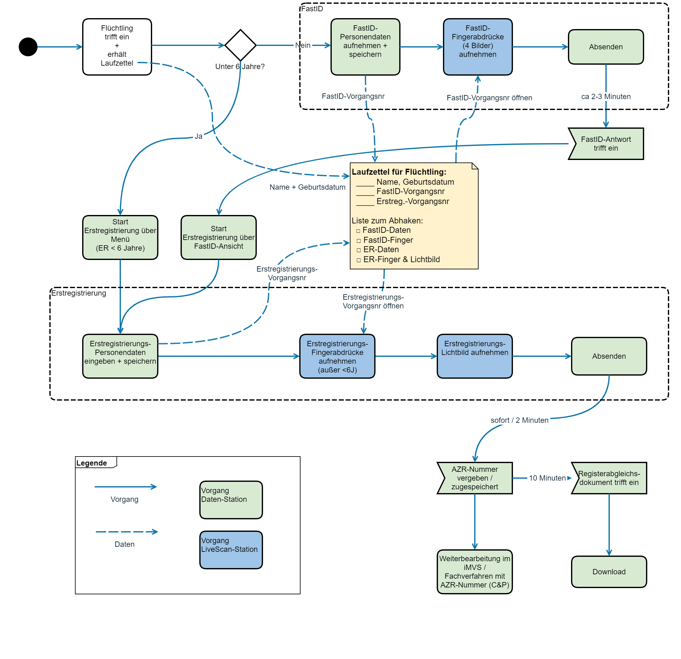 Die Erstregistrierung ist außerdem die erste behördliche Tätigkeit, die einem Flüchtling widerfahren soll. Durch sie, und nur sie, darf eine AZR-Nummer für einen Flüchtling, der Schutz (vorübergehenden) oder Asyl (dauerndes) begehrt, angelegt werden. Alle anderen Verfahren sind nachgelagert.