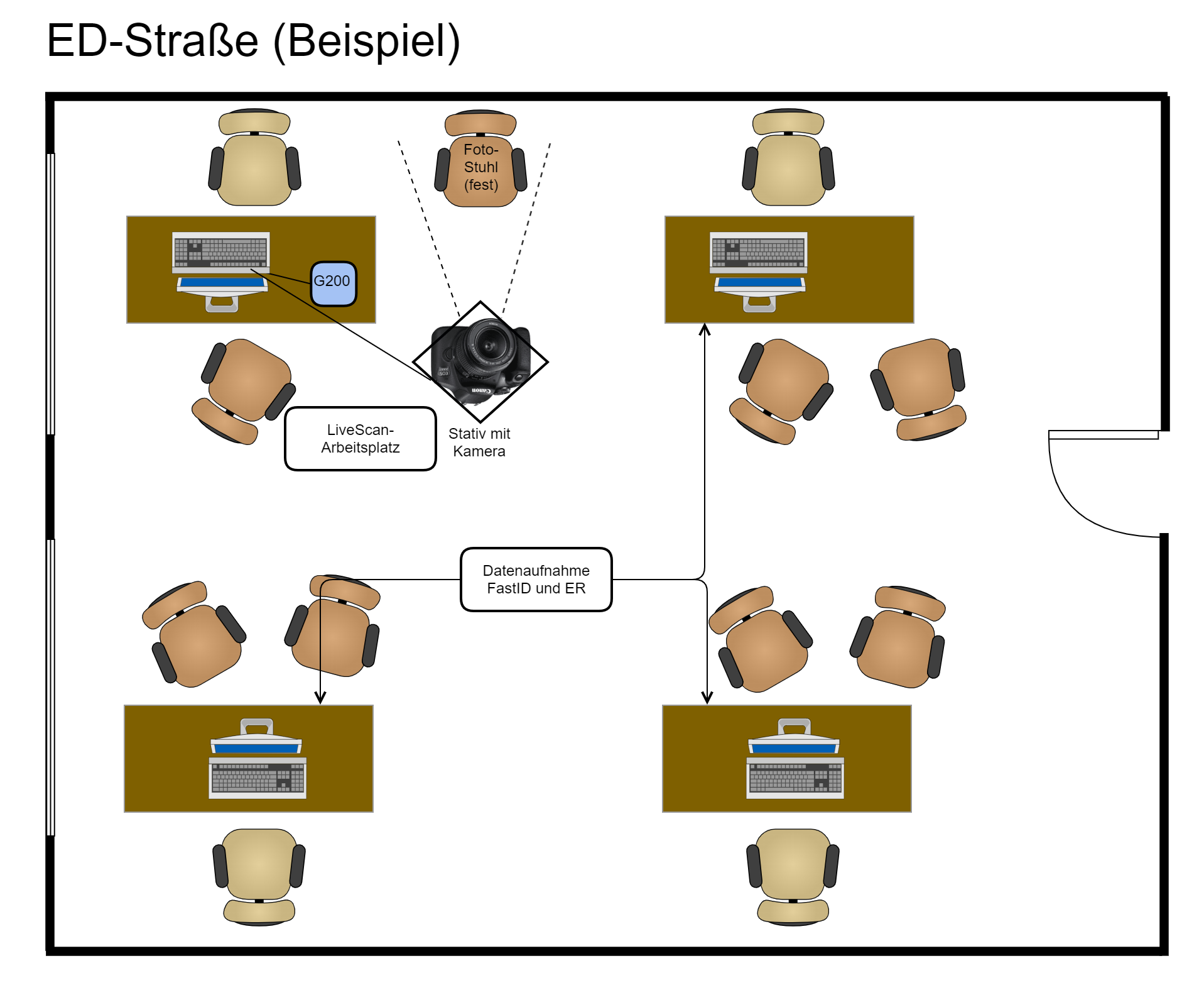 Diese Stationen erledigen alle Dateneingabe-Tätigkeiten, die Anlage der FastID- und Erstregistrierungs-Vorgänge, die Diskussion über Angaben mit Flüchtling und Dolmetscher, etc., den Versand der Vorgänge und das Überwachen der Rückmeldungen; und halten so dem Scanner den Rücken frei von Dingen, die ihn ohne Nutzen blockieren.