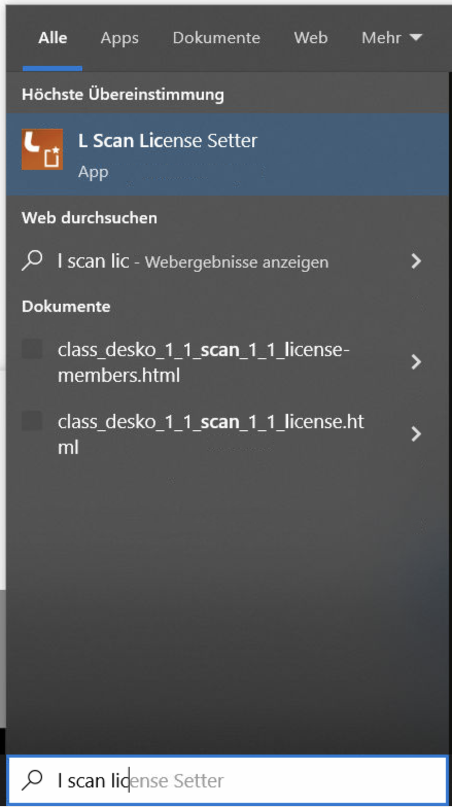 Geben Sie die "l scan lic" ein, bis das Programm "L Scan License Setter" gefunden wird. Starten Sie dieses.