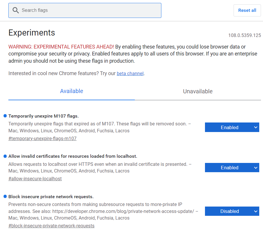 Bei Chrome oder Edge Chromium öffnen Sie einen Tab und tippen Sie als Adresse "about:flags" ein. Dann suchen Sie im Suchfeld oben in der Mitte der Seite "localhost" ein.