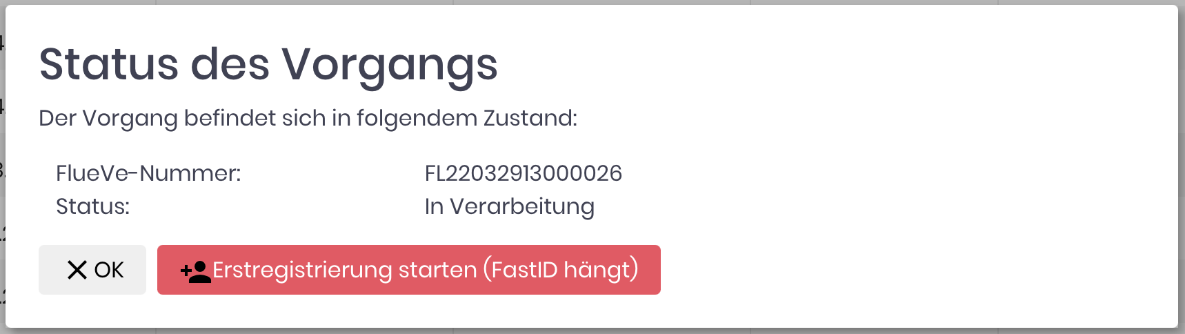 Bitte beachten Sie, dass Sie damit das Ergebnis der FastID vorwegnehmen, und dass die Erstregistrierung NUR abgesendet werden kann, wenn die FastID mittlerweile "Fertig" ist und eine Registrierung empfiehlt, entweder weil das System wieder antwortet, oder sie nochmals angefordert wurde.