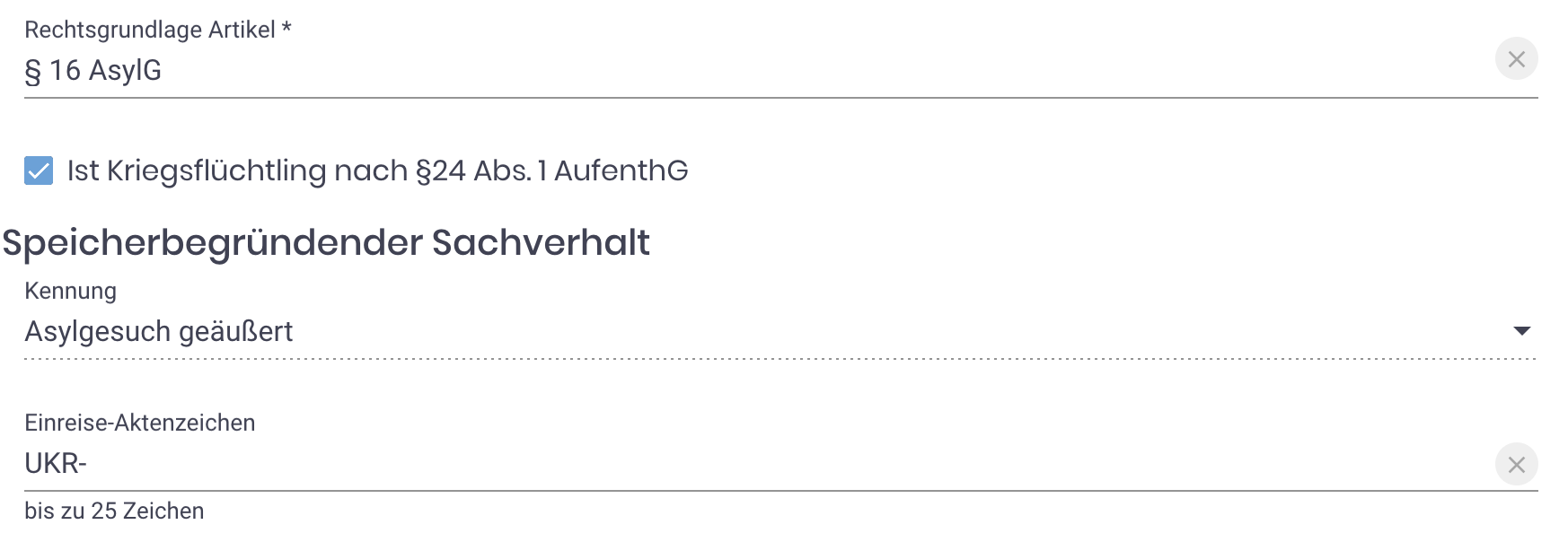 Rechtsgrundlage → Speicherbegründender Sachverhalt → Einreise-Aktenzeichen: "UKR-" (vor das, was Sie sonst hierin geschrieben hätten)