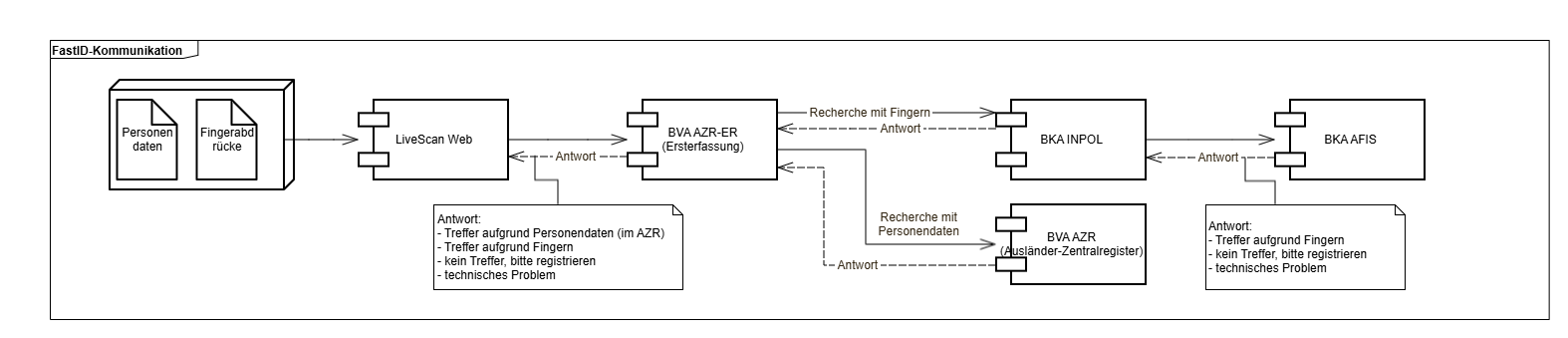 LiveScan Web für Ausländerbehörden übermittelt die gesammelten FastID- und Erstregistrierungsdaten für Vergleich und Eintragung an das BVA AZR-ER, das diese seinerseits mit weiteren Systemen abgleicht.