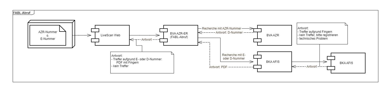 Der Abruf eines Fingerabdruckblatts vom BKA mittels BVA AZR-ER erfolgt aufgrund einer E-Nummer der Polizei (direkt) oder AZR-Nummer (durch Umsetzung in die passende D-Nummer der Polizei).